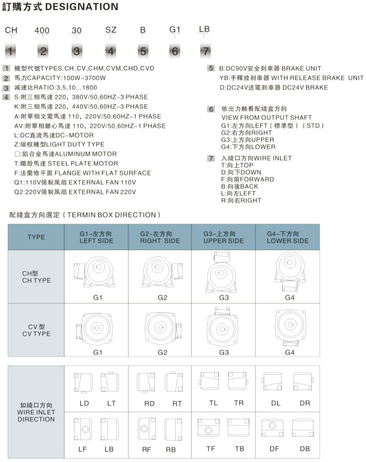机型代号:CH 马力:400W 减速比:30 附三相马达220,380V/50,60HZ-3 PHASE 缩框机型 DC90V安全刹车器 依出力轴看配线盒方向:左方向(标准型) 入线口方向:向左,向后